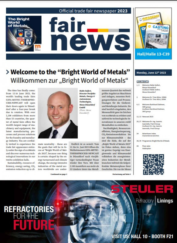 offers all relevant information (in German and English) on all events at the four leading trade fairs GIFA, METEC, THERMPROCESS and NEWCAST for visitors and exhibitors on a daily basis from 12-16 June 2023.