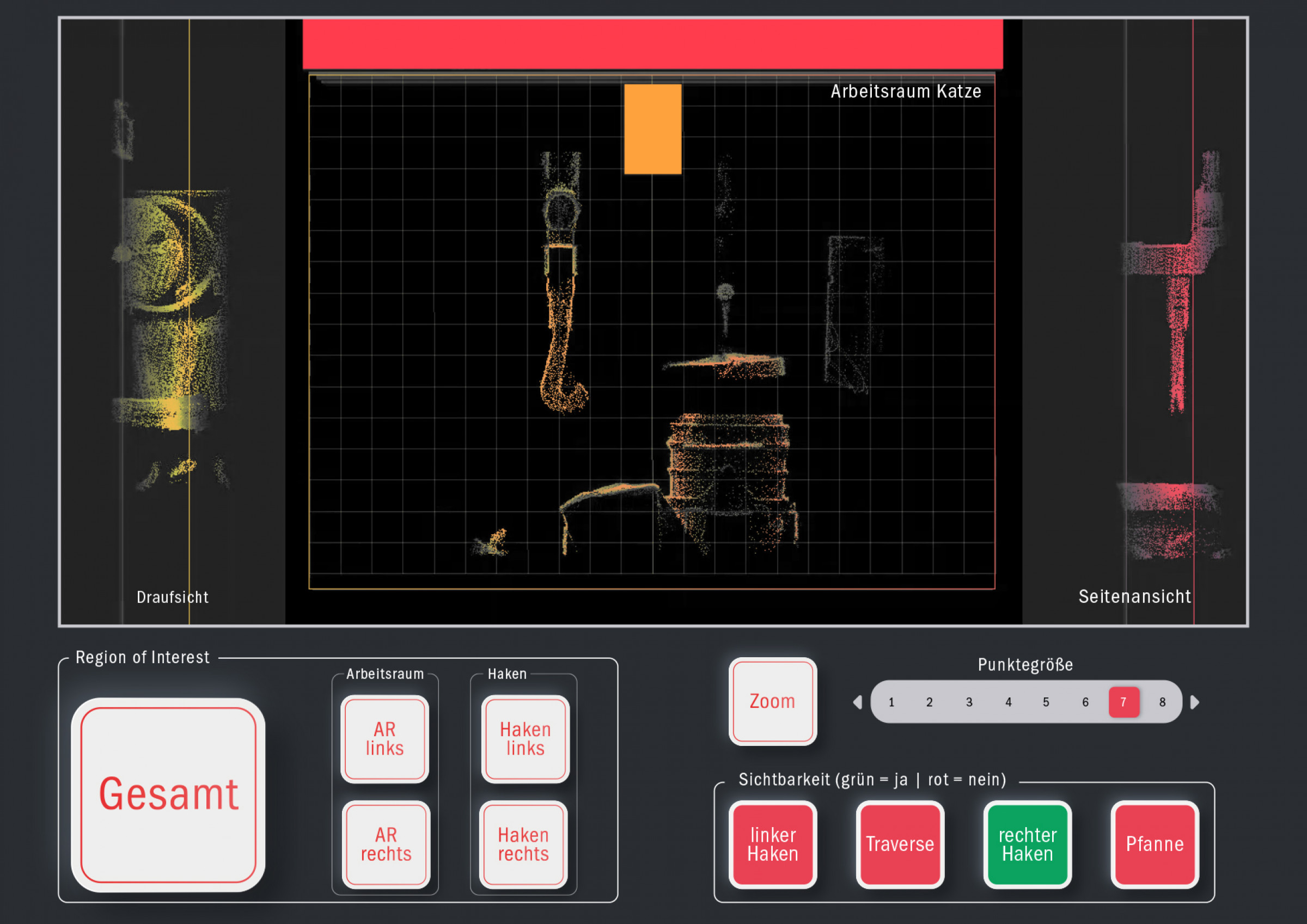 Ein Beispiel ist Pro-Kran-Assist, eine laser-basierte Systemlösung zur Erhöhung der Sicherheit beim Transport von feuerflüssigen Massen. Es ermöglicht dem Kranführer eine sichere Lastaufnahme in Echtzeit und das sogar in nicht einsehbaren Bereichen – und erhöht dabei sowohl die Arbeits- als auch die Prozesssicherheit.