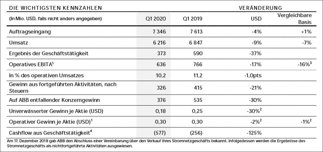 Vor dem Hintergrund der Covid-19-Pandemie hat sich der Auftragseingang im ersten Quartal robust entwickelt, wobei die Geschäftsbereiche Antriebstechnik und Industrieautomation von bedeutenden Großaufträgen profitierten. Der Umsatz ging jedoch in allen Geschäftsbereichen um 9 % auf 6,2 Mrd. $ zurück, da die Produktnachfrage infolge der Pandemie zuerst in China und dann auch in anderen Teilen der Welt nachgab. Zusätzlich wurden Systeminstallationen und Servicetätigkeiten durch Mobilitätseinschränkungen beeinträchtigt. Diese Entwicklungen drückten in allen Geschäftsbereichen auf die operativen Margen, zumal gewisse Kosten für die Aufrechterhaltung des Geschäftsbetriebs zwingend notwendig sind.