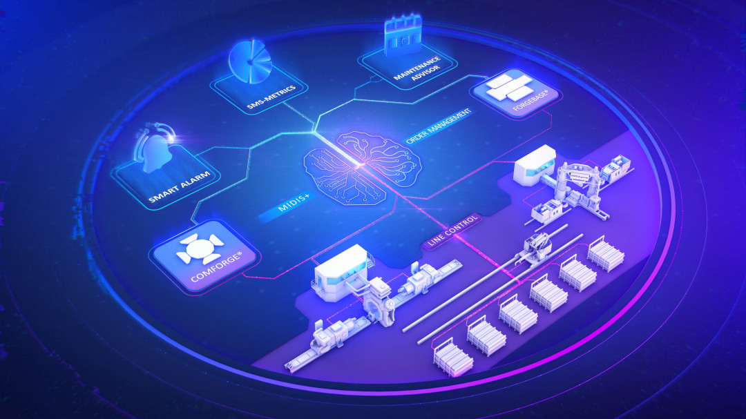 - Technologiepakete ForgeBase® und Comforge®. Modellerweiterungen, welche eine eigenschaftsorientierte Auslegung von Stichplänen unter Einbeziehung der Temperatur-und Umformparameter ermöglichen. Durch permanente Auswertung der Maschinen- und Prozessdaten sowie die Live-Visualisierung findet während des Schmiedens eine kontinuierliche Online-Optimierung der Schmiedestrategie und Umformverteilung statt.