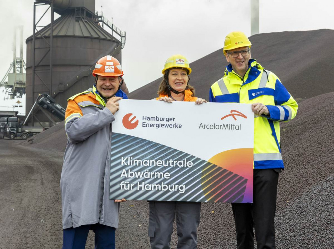 Mit lokaler Industrieabwärme die Energiewende in Hamburg vorantreiben: ArcelorMittal Hamburg wird den Hamburger Energiewerken (HEnW) die in seinen industriellen Prozessen entstehende Abwärme liefern. Monika Boh, CEO von ArcelorMittal Hamburg, und Michael Prinz, Geschäftsführer der Hamburger Energiewerke, unterzeichneten im Beisein von Jens Kerstan, Umweltsenator der Freien und Hansestadt Hamburg, einen Wärmeliefervertrag.