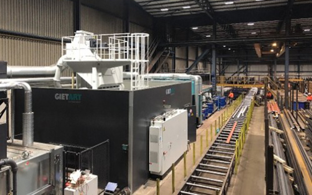 Nach drei Monaten ersetzt nun die neue Hochleistungsstrahlanlage Marathon A 1506 von Gietart ihren Vorgänger aus dem Jahr 1992. Mit je 22 kW Leistung pro Turbine und zusätzlicher Frequenzregelung verspricht die Anlage höhere Leistung, bessere Arbeitsergebnisse und eine Umwelttechnik, die den Anforderungen an eine moderne Produktion angepasst ist. Die Durchlassöffnung beträgt 1.600 mm x 700 mm und die Produkte werden mit einer Strahlqualität von SA 2,5 gestrahlt. Mit der Anlage wurden auch die Sicherheitstechnik und die Schaltschränke erneuert.