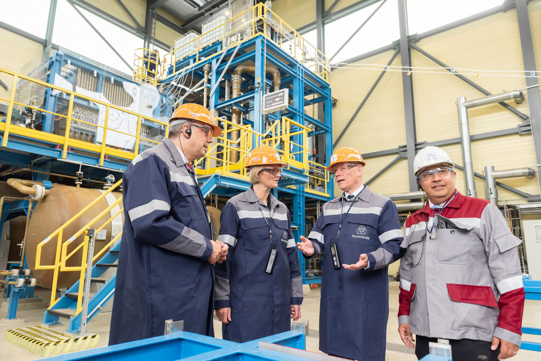 Bundesministerin Karliczek besichtigte den Hochofen 9 des Duisburger Stahlwerks und das Technikum Carbon2Chem. Beide Stationen stehen für die Parallelstrategie, die der Konzern bei der Verringerung von CO2-Emissionen aus dem Stahlwerk verfolgt. Bei Carbon2Chem, vom Bundesministerium für Bildung und Forschung mit mehr als 60 Mio. € gefördert, geht es um die Umwandlung von Stahlwerksemissionen in chemische Grundstoffe, einschließlich des in den Hüttengasen enthaltenen CO2. Der Hochofen 9 steht für die sogenannte Wasserstoffroute, bei der thyssenkrupp die Stahlproduktion schrittweise von Kohlenstoff auf Wasserstoff als Reduktionsmittel umstellen wird, sodass erst gar kein CO2 entsteht.