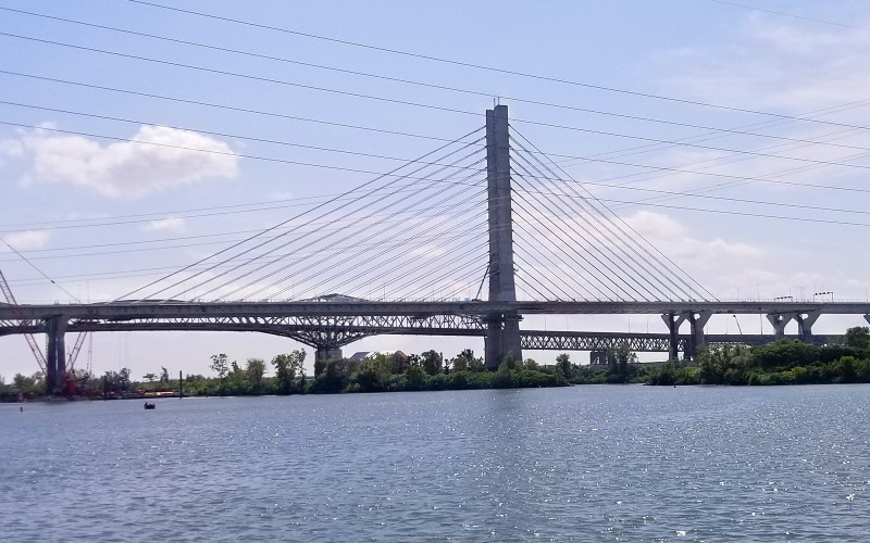 Die Samuel-De-Champlain-Brücke ist eine 3 km lange Doppelschrägseilbrücke und gehört sowohl zu den breitesten als auch zu den fortschrittlichsten Brücken der Welt. Sie wurde als Ersatz für die funktional veraltete und durch Streusalz beeinträchtigte, ursprüngliche Champlain-Brücke über dem Sankt-Lorenz-Strom im kanadischen Québec gebaut. Um den harten kanadischen Wintern zu trotzen, wurden Edelstahl und Hochleistungsbeton verwendet. Insgesamt haben 1.600 Arbeiter 93.000 m3 Beton gegossen, mehr als 72.000 t Stahl verbaut und 1,2 Mio. Schrauben festgezogen.