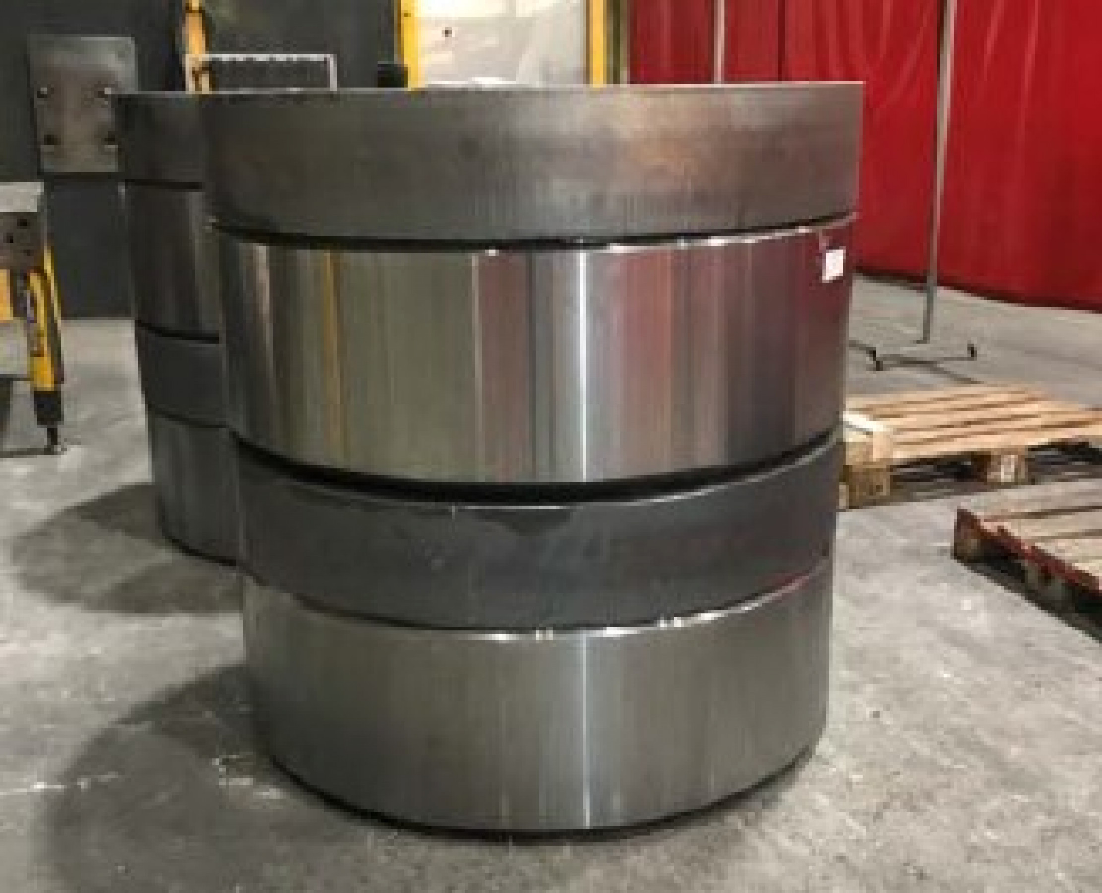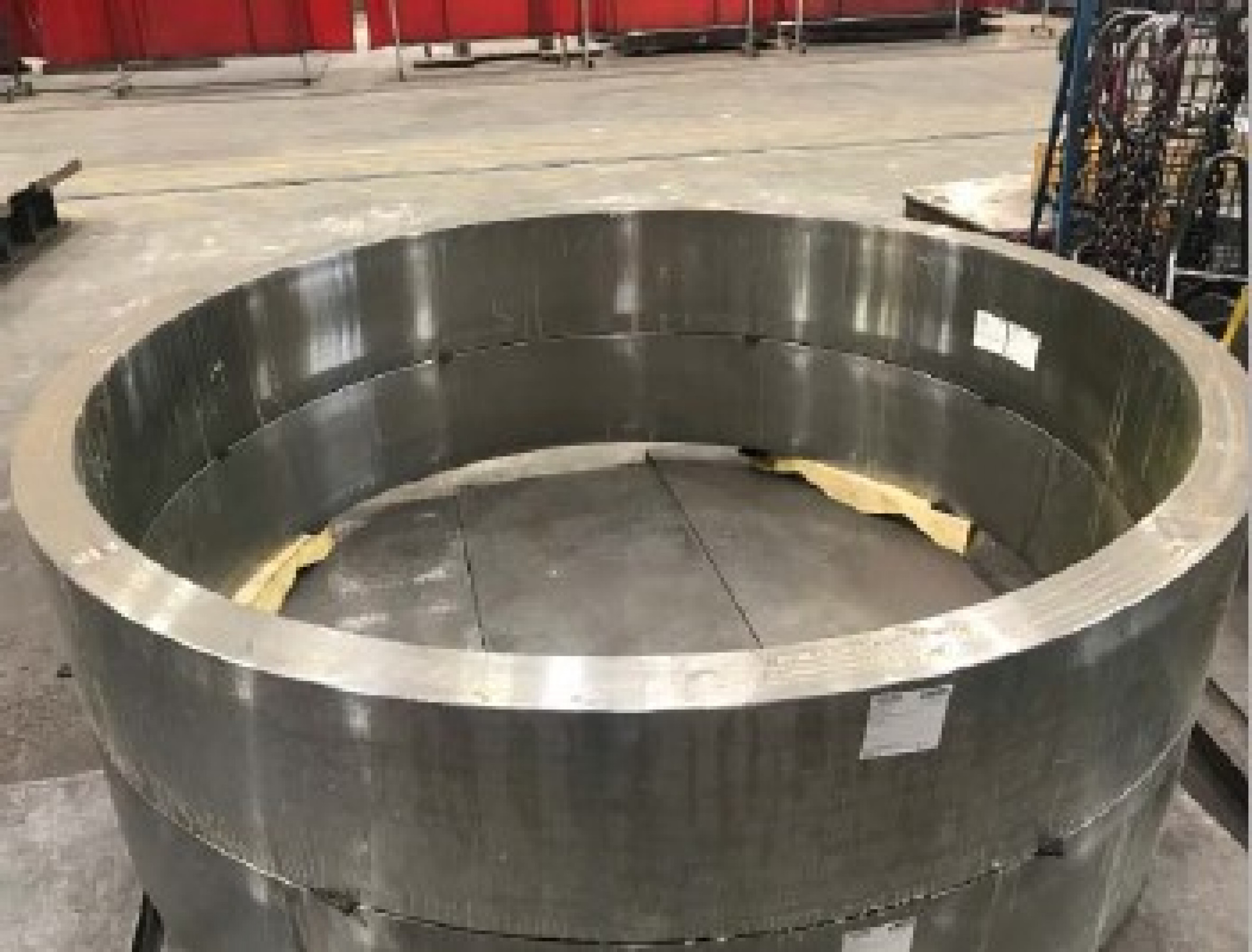 Mit einem Durchmesser von 2.270 Millimetern, einer Höhe von 1.391 Millimetern und 12 Tonnen Gewicht war jedes dieser Bauteile ein richtiger Koloss. Gefertigt wurde er aus Blechen der Güte S235JR mit bis zu 210 Millimetern Dicke. Für den äußeren Zahnkranz stellte der Kunde einen Rohling aus 42CrMo4 QT bei. Der Auftrag an den Brennschneidspezialisten umfasste neben Erstellen und Zukaufen aller benötigten Teile, auch Schweißen der Baugruppen, Spannungsarmglühen, Strahlen und Grundieren.