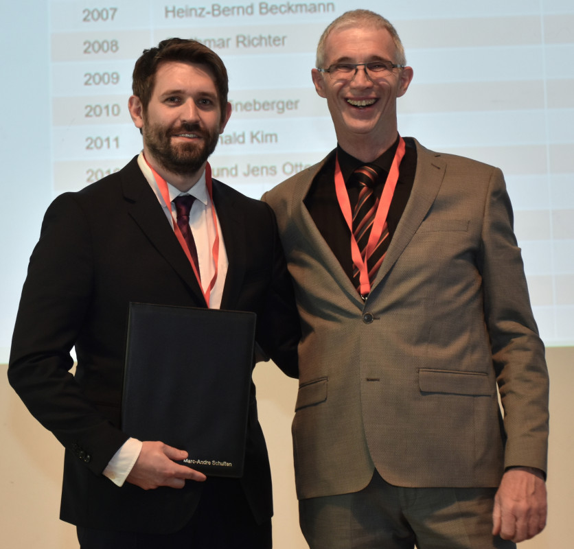 Der Preis ging zum dritten Male in Folge an die Kokerei Schwelgern. Am Ende des ersten Veranstaltungstages erhielt Herr Dipl.-Ing. Marc-André Schulten den mit 5.000 € dotierten Förderpreis der Stiftung zur Förderung des Kokereiwesens in Technik und Wissenschaft. Er wurde für sein wissenschaftliches Engagement beim Aufbau des Technikums für Kohle und Koks bei thyssenkrupp Steel Europe sowie seinen Einsatz in der Kokerei-Lehre an der RWTH Aachen geehrt.