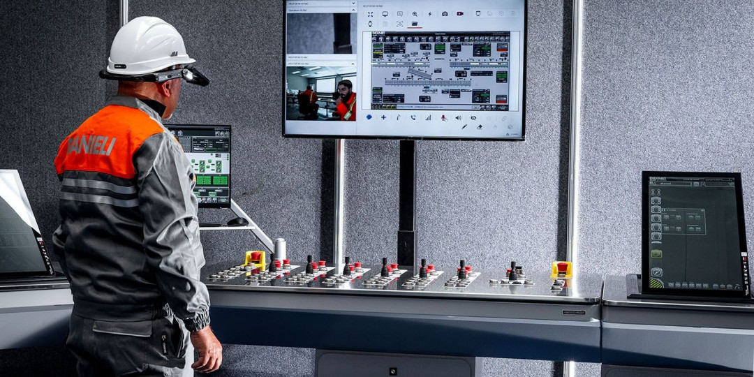 Danieli Automation Q-Space1 Augmented Reality, Expertensystem und künstliche Intelligenz ermöglicht die erweiterte Zusammenarbeit von Teams, indem sie die Mitarbeiter durch eine Kombination aus Live-Video, Audio und Anmerkungen der gemeinsamen Live-Ansicht zusammenführten. Das komplette Automatisierungssystem der Warmbandstraße wurde in einem eigens dafür vorgesehenen Raum am Hauptsitz von Danieli Automation installiert, zusammen mit der für den Echtzeit-Datenaustausch und die gemeinsame Live-Ansicht erforderlichen Hard- und Software. Q-Space1 wurde mit einer fest installierten Kamera, die eine Panoramaaufnahme des Anlagenbereichs bietet, und einer am Helmkamera eingerichtet, um die Details der Hauptkontrollpulte und der lokalen Kontrollstationen zu betrachten. Die Teams von Danieli Automation und Nucor führten den gesamten Test so durch, als befänden sie sich im selben Raum, wobei das Nucor-Team das System eigentlich von fern bediente und das Danieli Automation-Team als Beobachter fungierte und die "physische" Schnittstelle mit der Automationshardware bereitstellte. Beide Teams konnten die gleichen Anwendungssoftware-Tools in Echtzeit gemeinsam nutzen, wodurch die Struktur der verschiedenen Steuerungs-funktionen geklärt werden konnte.