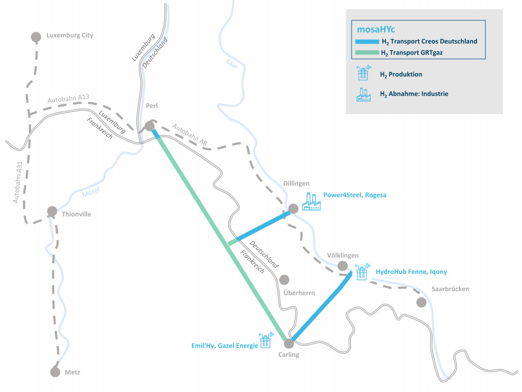 Mit der Unterzeichnung legen die Partner den Grundstein für den Aufbau des grenzüberschreitenden Wasserstoffnetzes mosaHYc, welches noch im Jahr 2027 in Betrieb gehen soll. mosaHYc soll den Transport von Wasserstoff zum Stahlstandort Dillingen gewährleisten, damit dort die Produktion von CO2-reduziertem Stahl (Dekarbonisierungsprojekt Power4Steel) starten kann.