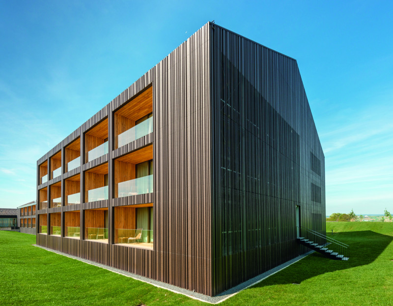 Bei der Suche nach einem Werkstoff für die neue Fassade standen zwei Anforderungen im Mittelpunkt: erstens große Designfreiheit, um die Ideen der Architekten umzusetzen und zweitens Nachhaltigkeit, denn auf die hat sich das Hotel-Resort in Donaueschingen ganz generell ausgerichtet. Das brachte den bandbeschichteten Stahl pladur® Relief Icecrystal von thyssenkrupp Steel ins Spiel, denn für den entschied sich der Metallbearbeitungsspezialist Arnold AG, der als Generalunternehmer die Fassadengestaltung verantwortete.