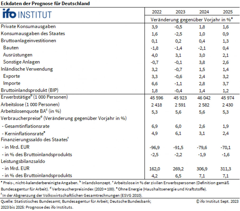 Das ifo Institut hat seine Konjunkturprognose für 2023 bestätig. Demnach wird die deutsche Wirtschaftsleistung um 0,4 Prozent schrumpfen. Im kommenden Jahr wird sie dann um 1,4 Prozent steigen, 0,1 Prozentpunkte weniger als bislang gedacht. Im Jahre 2025 wird das Wachstum 1,2 Prozent betragen.