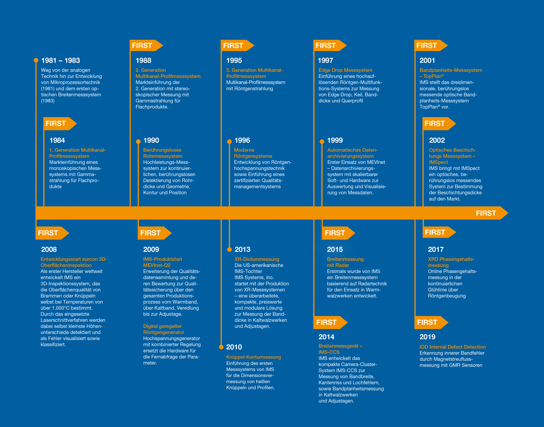 Seit der Firmengründung liegt der Fokus der IMS auf der rechnergestützten Signalverabeitung, die zu dieser Zeit die Voraussetzung für simultan messende Mehrkanal-Messysteme bildete. Das bekannteste IMS Mehrkanal-Messsystem war die Profilmessung der ersten Generation für warmgewalzte Flachprodukte aus dem Jahre 1983. Bereits im darauffolgenden Jahr erweiterte die IMS ihre Produktpalette um optische Messsysteme. Auch die Röntgentechnik wurde bereits Ende der 80er Jahre eingeführt.