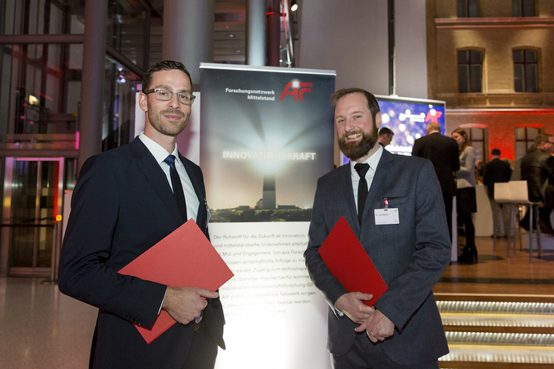 Die Lösung für dieses Problem haben jetzt drei Wissenschaftler im Rahmen eines vom AiF-Mitglied Center of Maritime Technologies e.V. (CMT) koordinierten Projekts der Industriellen Gemeinschaftsforschung (IGF) gefunden: Dr. Lars Molter und Dr. Rafael Luterbacher-Mus, bis 2018 beide am CMT in Hamburg, entwickelten gemeinsam mit Dr. Rigo Peters von der Schweißtechnischen Lehr- und Versuchsanstalt Mecklenburg-Vorpommern GmbH (SLV M-V) die Technologie FAUSST (Faserverbund-und- Stahl-Standardverbindung). Damit ist es erstmals möglich, Faserverbundbauteile und Stahlbauteile mithilfe eines hybriden Gewirks ohne jedwede mechanische Sicherung fest und sicher zusammenzufügen. Die so verbundenen Strukturen genügen auch den größten Anforderungen sowohl im Fahrzeug- und Schiffbau, als auch in der Luft- und Raumfahrt. Für ihre Leistungen wurden die Forscher gestern in Berlin mit dem Otto von Guericke-Preis der AiF ausgezeichnet. Der Preis wird einmal im Jahr für herausragende Leistungen auf dem Gebiet der IGF vergeben und ist mit 10.000 € dotiert. Die vorwettbewerbliche IGF wird im Innovationsnetzwerk der AiF und ihrer 100 Forschungsvereinigungen organisiert und vom Bundesministerium für Wirtschaft und Energie (BMWi) mit öffentlichen Mitteln gefördert.