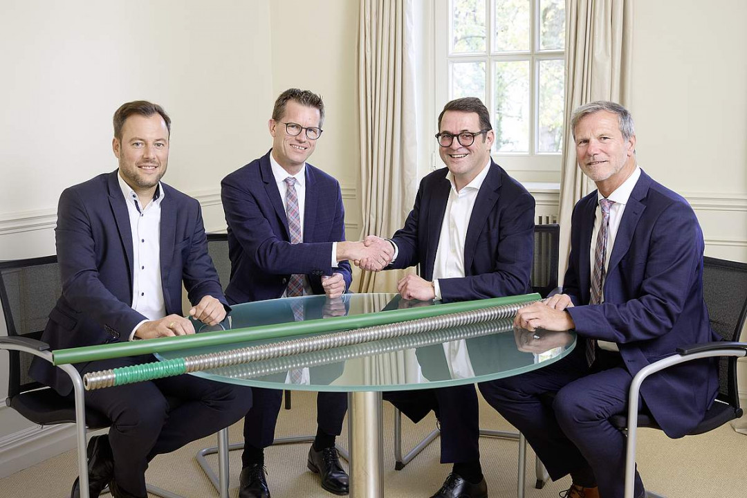 Foto (v.l.n.r.): Dennis Pospischil (BENTELER Steel/Tube), Björn Ischebeck, Ralph Mathis (BENTELER Steel/Tube), Uwe Nieselt (Ischebeck) setzen gemeinsam neue Maßstäbe im nachhaltigen Bauen