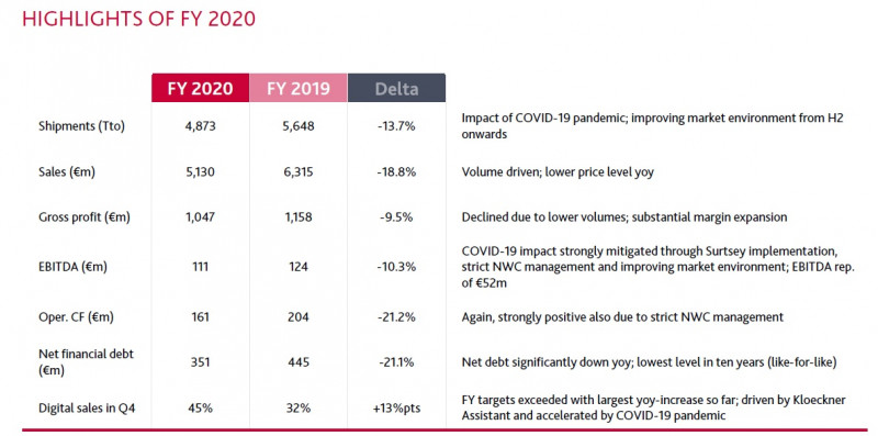 Die mit der COVID-19-Pandemie einhergehenden Marktbelastungen haben im Geschäftsjahr 2020 bei Klöckner & Co zu einem Umsatzrückgang von rund 19 % auf 5,1 Mrd. € geführt. Der negative Einfluss auf das operative Ergebnis (EBITDA) vor wesentlichen Sondereffekten konnte durch das Transformationsprojekt Surtsey auf einen Rückgang um 10 %, von 124 Mio. € auf 111 Mio. €, begrenzt werden. Zusätzlich belastet durch Restrukturierungsaufwendungen von 59 Mio. € lag das Konzernergebnis bei -114 Mio. € nach -55 Mio. € im Vorjahr. Entsprechend betrug das Ergebnis je Aktie -1,16 € (2019: -0,56 €).