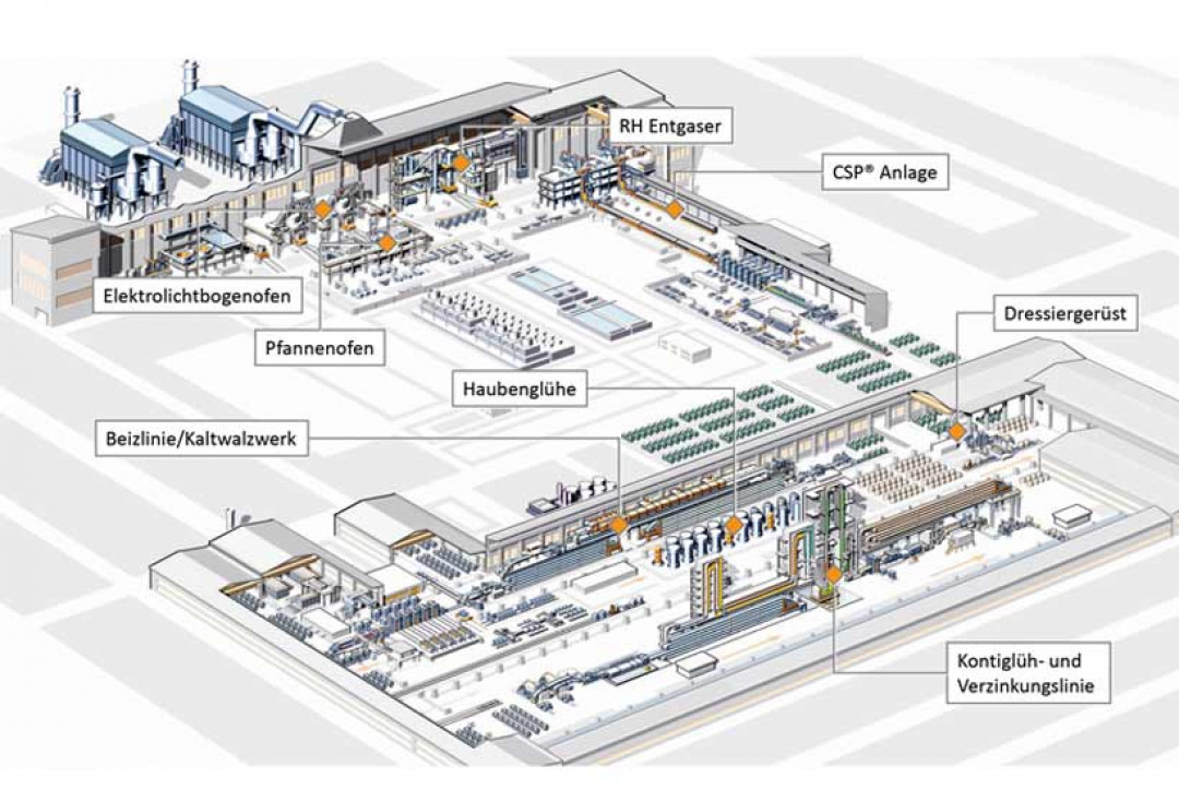 Der neue Anlagenkomplex sollte deshalb die gesamte Prozesskette von der Stahlerzeugung bis hin zur Feuerverzinkung abdecken. Mit dem Spatenstich Ende September 2014 fiel der Start-schuss für das Projekt. Die gesamte Prozesstechnik einschließlich der Elektrik und Automation sowie der Umwelttechnik wurde von der SMS group geliefert. Die Inbetriebnahme des Anlagenkomplexes erfolgte am 11. Dezember 2016 mit der ersten Schmelze, dem ersten Guss und dem ersten gewalzten Coil.