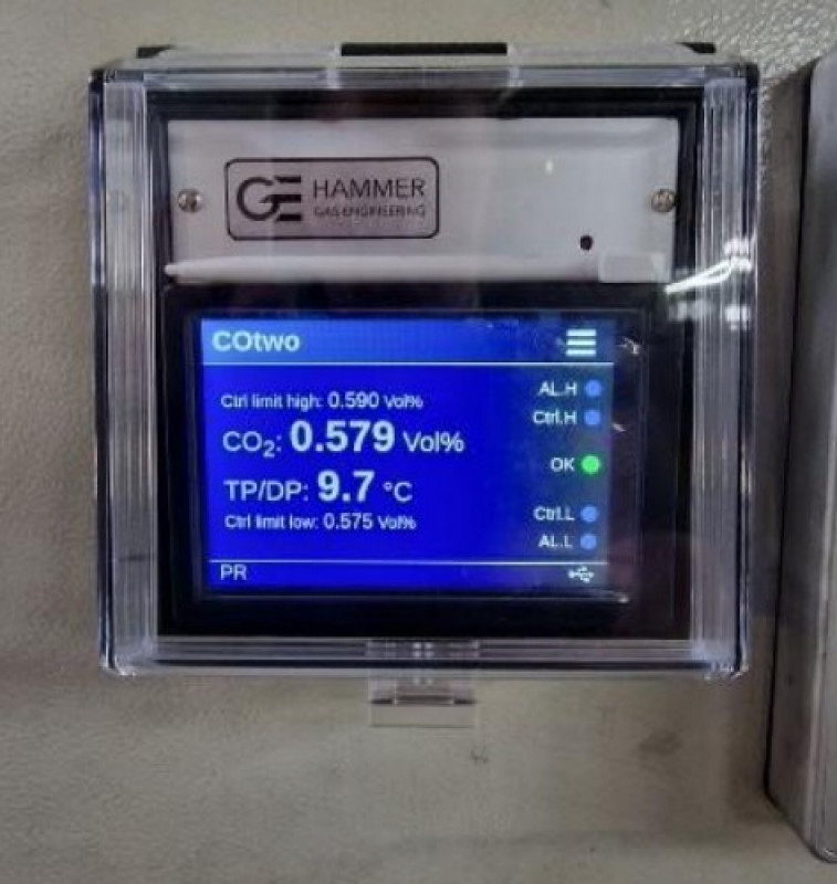 Der eigentliche CO2-Sensor ist einbaufertig in einem Aluminiumgehäuse mit Interfaceplatine integriert. Er kann mittels einer 6mm Klemmringverschraubung für Gaseintritt und –austritt einfach im Bypass zu der Endogasprozessgasleitung eingebaut werden. Die robuste Ausführung erlaubt den Einsatz in einem rauen Härtereiumfeld. Verbunden wird der Sensor mit dem hierfür eigens entwickelten CO2-Regler. Der Regler ist für den Schaltschrankeinbau vorgesehen. Seine einfache Bedienung erfolgt über ein 3,5“ Touch-Display, in dem die Features für eine Endogasregelung problemlos eingestellt werden können. Die Anzeige des CO2-Gehaltes im Endogas wird in Vol. % angezeigt. Auf Kundenwunsch kann neben dem CO2-Wert auch parallel der dazugehörige Taupunkt angezeigt werden. Für den Regler ist eine Spannungsversorgung von 230 V, 50 Hz erforderlich.