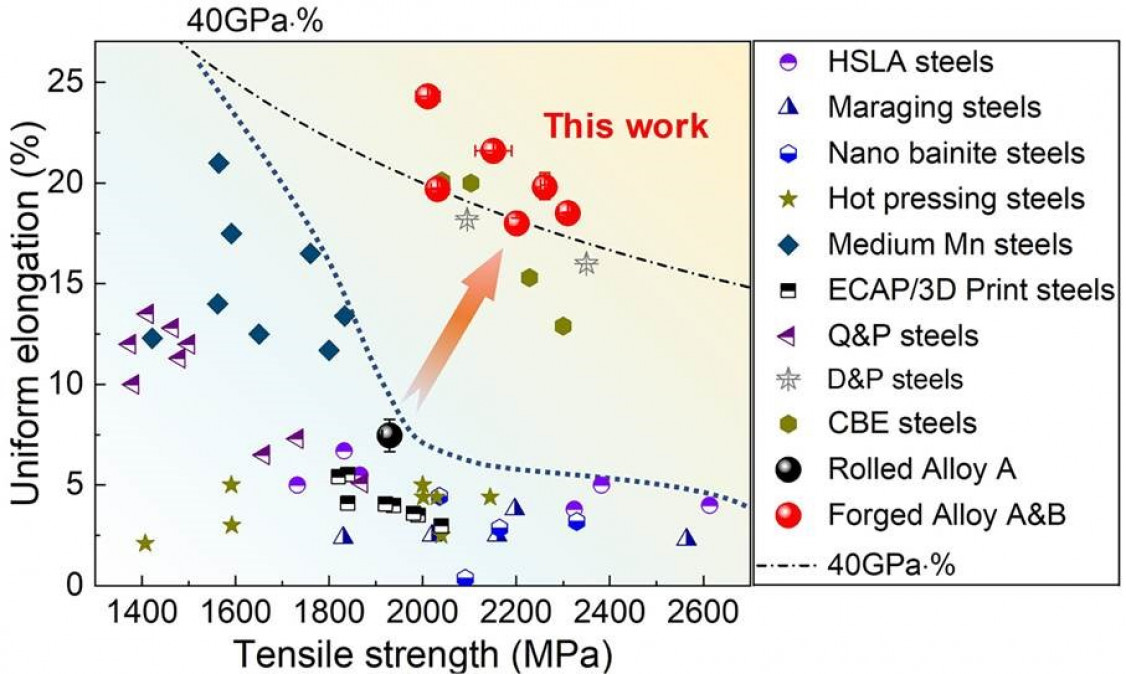 Die Wissenschaftlerinnen und Wissenschaftler setzten Transmissions- und Rasterelektronenmikroskopie sowie Atomsondentomographie ein, um das Material bis auf die atomare Ebene zu charakterisieren und den Einfluss der einzelnen Verarbeitungsschritte zu erkennen. Das Schmieden führt beispielsweise zu einer höheren Versetzungsdichte und zu stärker verteilten Nanoausscheidungen, was zu einer höheren Dehnbarkeit führt. Die hohe Duktilität ist eine Folge der Versetzungen im Martensit und der allmählichen, durch Verformung angeregten Phasenumwandlung.