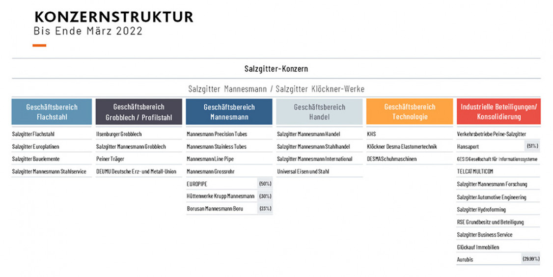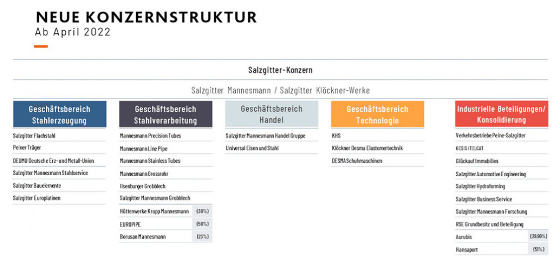 Im Zuge der Strategie „Salzgitter AG 2030“ wird mit Wirkung zum 1. April 2022 die bestehende Geschäftsstruktur weiter gestrafft. In den neuen Geschäftsbereichen „Stahlerzeugung“ und „Stahlverarbeitung“ werden die Stahlaktivitäten des Konzerns entsprechend der Wertschöpfung und der Kundenbedürfnisse neu gebündelt. Damit ist der Salzgitter-Konzern zukünftig in vier, statt zuvor fünf Segmente gegliedert.