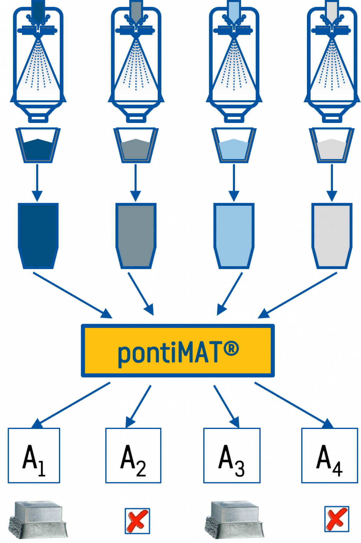 Es macht erstmals die Herstellung und Erprobung unterschiedlichster Legierungsvarianten innerhalb kürzester Zeit möglich. Mit dem pontiMAT Verfahren können anwendungsspezifische Werkstoffe sehr schnell und mit geringstem Ressourceneinsatz hergestellt und erprobt werden. Es bietet maximale Flexibilität bei der Auswahl der metallischen Legierungselemente und gezielt einstellbare Abkühlraten. So eignet es sich besonders für die Entwicklung neuartiger Werkstoffe für die Additive Fertigung.