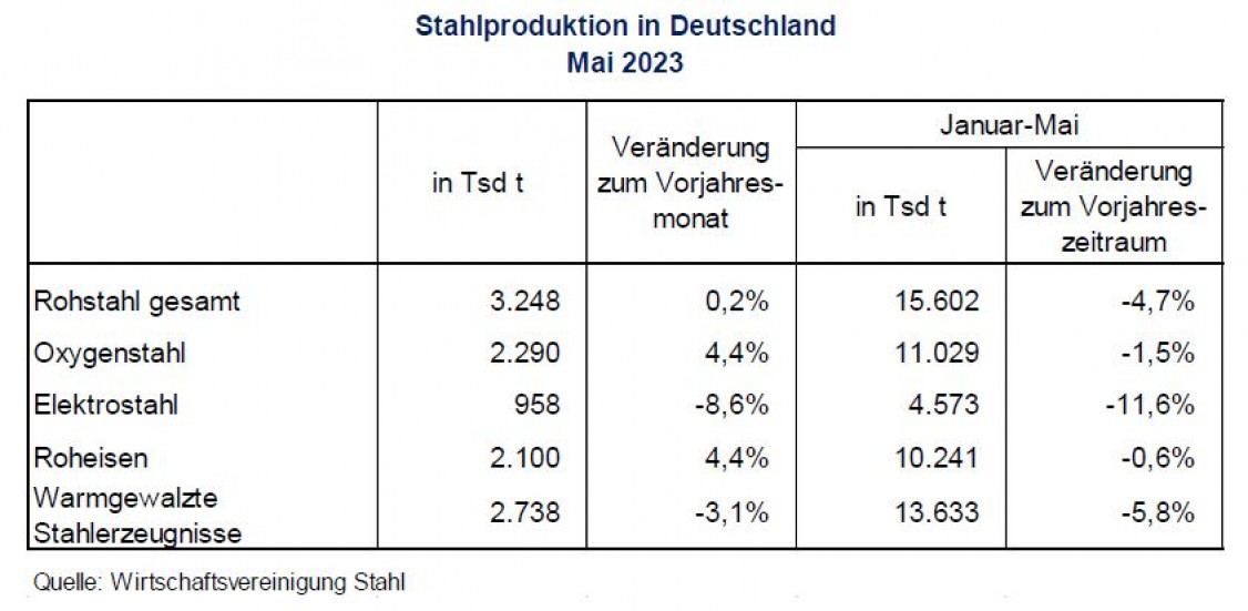 Die Rohstahlerzeugung in Deutschland befindet sich im Mai 2023 mit 3,2 Millionen Tonnen weiterhin auf einem niedrigen Niveau. Im bisherigen Jahresverlauf wird damit der Vergleichswert des Vorjahres um 5 Prozent unterschritten.