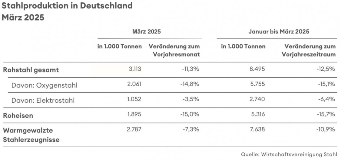 Damit verzeichnet die Branche bereits den dritten Monat in Folge einen zweistelligen Rückgang. Im ersten Quartal 2025 wurden insgesamt 12,5 Prozent weniger Rohstahl produziert als im gleichen Zeitraum des Vorjahres.