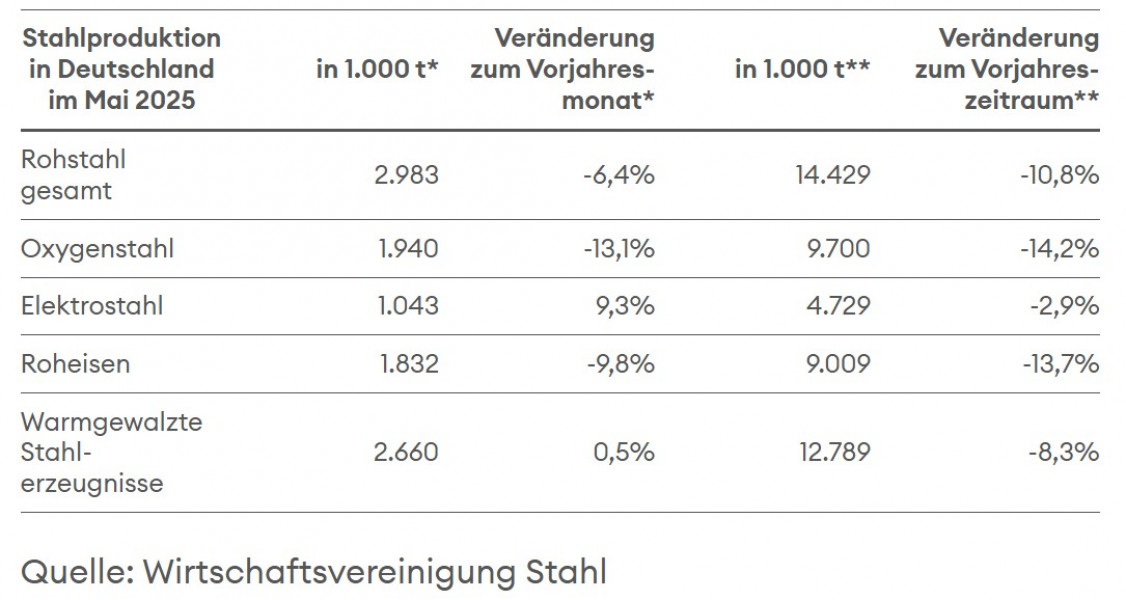 Für die ersten fünf Monate des Jahres 2025 ergibt sich damit eine insgesamt stark negative Bilanz: Die Rohstahlproduktion lag in diesem Zeitraum rund 11 Prozent unter dem Vorjahreswert.