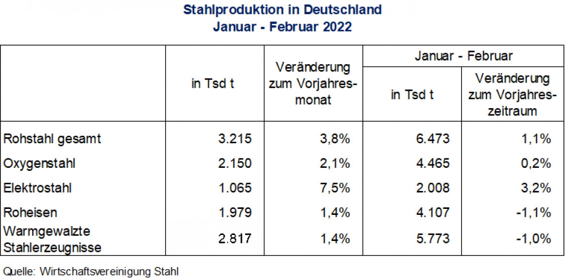 In Deutschland wurden im Februar 2022 rund 3,2 Millionen Tonnen Rohstahl produziert.