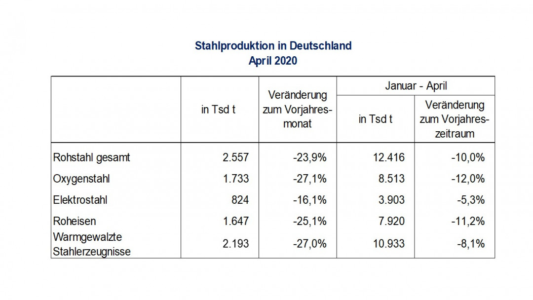 Die Rohstahlproduktion in Deutschland ist im April infolge der Corona-Pandemie deutlich zurückgegangen, meldet die Wirtschaftsvereinigung Stahl in Düsseldorf. Die Stahlerzeugung sank gegenüber dem Vorjahresmonat um 24 %, nach einem Rückgang von 6 % im ersten Quartal 2020. Mit 2,6 Mio. t wurde so wenig Rohstahl hergestellt wie seit Juni 2009 nicht mehr.