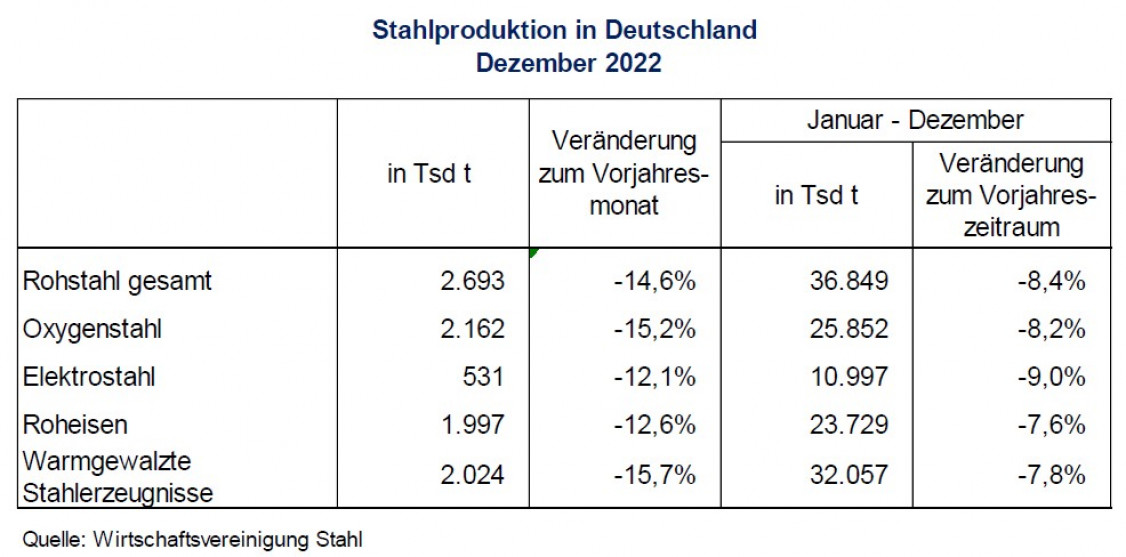 Im Jahr 2022 wurden mit 36,8 Millionen Tonnen Rohstahl rund 8 Prozent weniger hergestellt als im Vorjahr. Dies markiert (mit Ausnahme des Corona-Jahres 2020) den niedrigsten Jahreswert seit 2009.