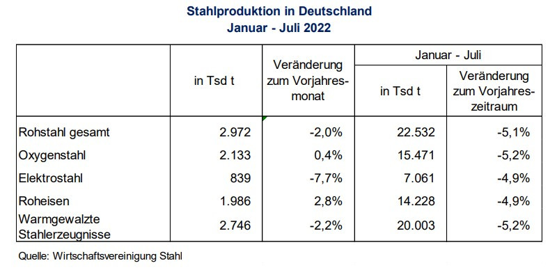 Im Zeitraum von Januar bis Juli 2022 wurden rund 5 Prozent weniger Rohstahl hergestellt als im entsprechenden Vorjahreszeitraum.