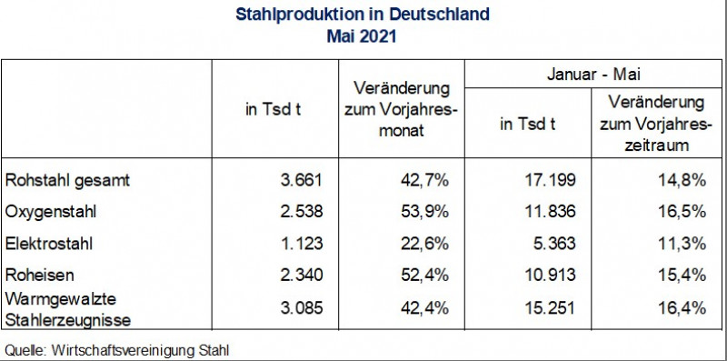 Die Rohstahlproduktion in Deutschland ist weiter aufwärtsgerichtet. Im Mai 2021 lag das Volumen bei rund 3,7 Millionen Tonnen. Im Vergleich zum Vorjahresmonat, der stark von den Folgen der Corona-Pandemie gekennzeichnet war, entspricht dies einem Zuwachs von rund 43 Prozent. Im Zeitraum Januar bis Mai 2021 ist die Rohstahlerzeugung im Vorjahresvergleich um rund 15 Prozent gestiegen.