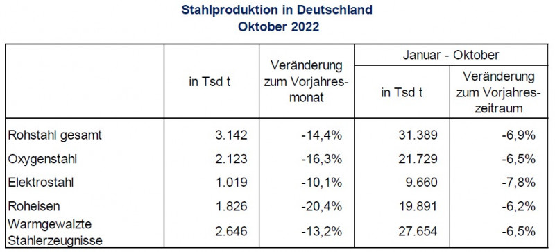 Die Rohstahlerzeugung in Deutschland ist im Oktober 2022, wie bereits im Vormonat, mit zweistelliger Rate gesunken. Im Berichtsmonat wurden mit rund 3,1 Millionen Tonnen 14,4 Prozent weniger Rohstahl hergestellt als im Vorjahresmonat.