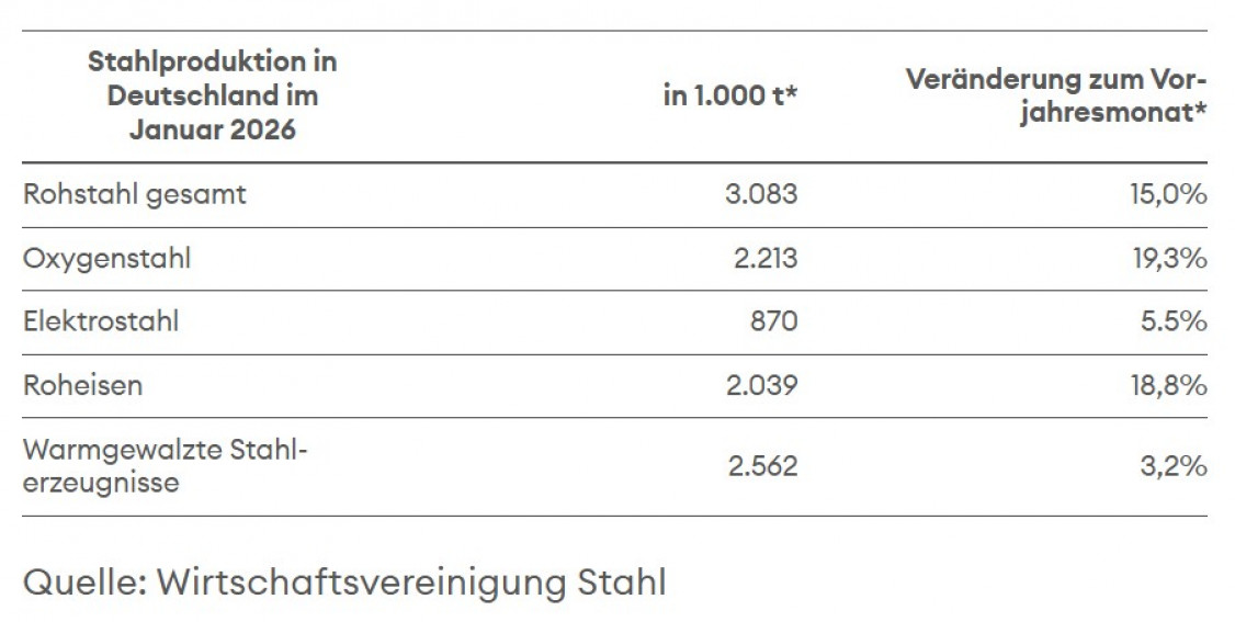Die Stahlproduktion in Deutschland ist im Januar 2026 kräftig gestiegen. Mit rund 3,1 Millionen Tonnen lag die Erzeugung um 15 Prozent über dem Wert des Vorjahresmonats.
