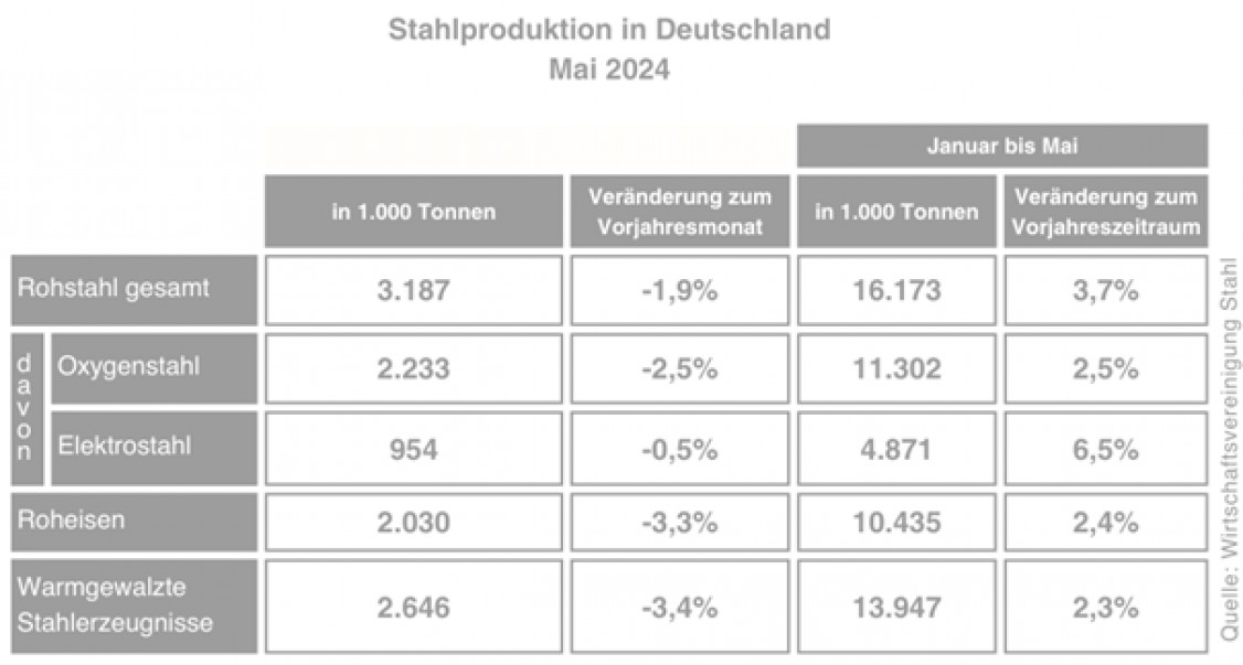 Die Rohstahlerzeugung in Deutschland befindet sich im Mai 2024 mit knapp 3,2 Millionen Tonnen weiterhin auf einem niedrigen Niveau. Im Vergleich zum Vorjahresmonat wurden ca. 2 Prozent weniger Stahl hergestellt. Damit war die monatliche Stahlproduktion in diesem Jahr erstmals rückläufig. In den ersten fünf Monaten des Jahres wurden insgesamt rund 16,2 Millionen Tonnen Rohstahl erzeugt – ein Plus von rund 4 Prozent gegenüber dem Vorjahreszeitraum.