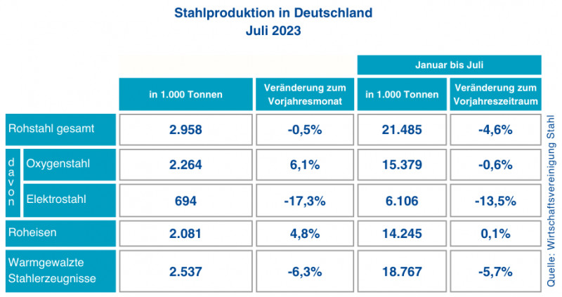 Auch im Juli 2023 ist die Rohstahlerzeugung in Deutschland weiter zurückgegangen. Gerade die bereits heute schon relativ emissionsarme, aber stromintensive Elektrostahlherstellung verzeichnet mit -17,3 Prozent im Vergleich zum Vorjahresmonat erneut deutliche Produktionsrückgänge.