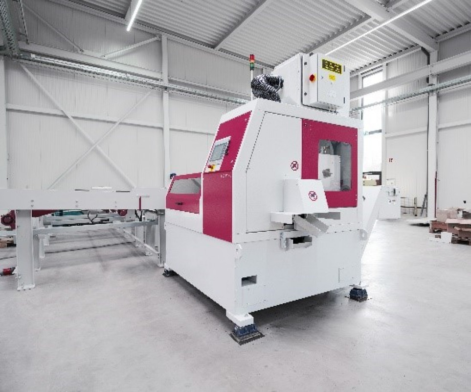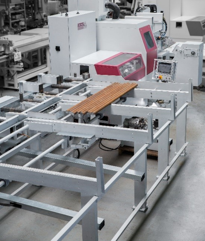Um ein breites Materialspektrum ab 20 mm bis 150 mm Durchmesser abdecken zu können, kann die Übergabeeinrichtung auf den zu sägenden Durchmesser eingestellt werden. An der Rollenbahn selbst sind robuste vertikale Führungsrollen und separat auf dem Boden abstützende Anschläge mit Dämpfungsplatten angebracht. Beim Übergeben der Stäbe vom Lager auf die Rollenbahn schwenken zuerst die Führungsrollen zurück, damit das Material möglichst geräuscharm gegen die dämpfenden Anschläge stößt. Anschließend fahren die vertikalen Führungsrollen wieder in Position und richten die Stäbe zur Maschinenebene aus. Die Spannzange, angetrieben über Servomotor und Kugelrollspindel, sorgt für den präzisen Materialnachschub in der Hochleistungskreissäge. Serienmäßig bietet die Säge eine gesteuerte Nullkante. Sie bewirkt, dass das Material beim Positionieren nicht die Spannbacken berührt. Dadurch werden Beschädigungen vermieden und eine höhere Oberflächenqualität erreicht.