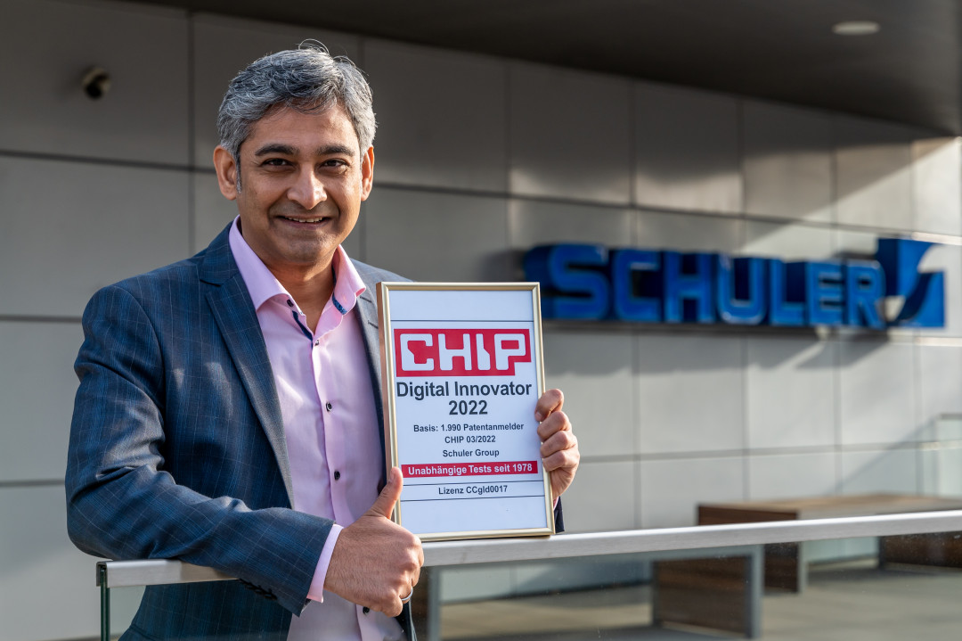 Die Fachzeitschrift „Chip“ hat zusammen mit ihrem Partner Globis Management Consulting die Patentanmeldungen zu „digital relevanten Neuentwicklungen“ von 2018 bis 2020 untersucht. Von rund 2.000 deutschen Unternehmen schaffte es dabei nur jedes zehnte in die engere Auswahl. Dazu zählt auch der Göppinger Pressen-Hersteller Schuler, der sich nun „Digital Innovator 2022“ nennen darf.