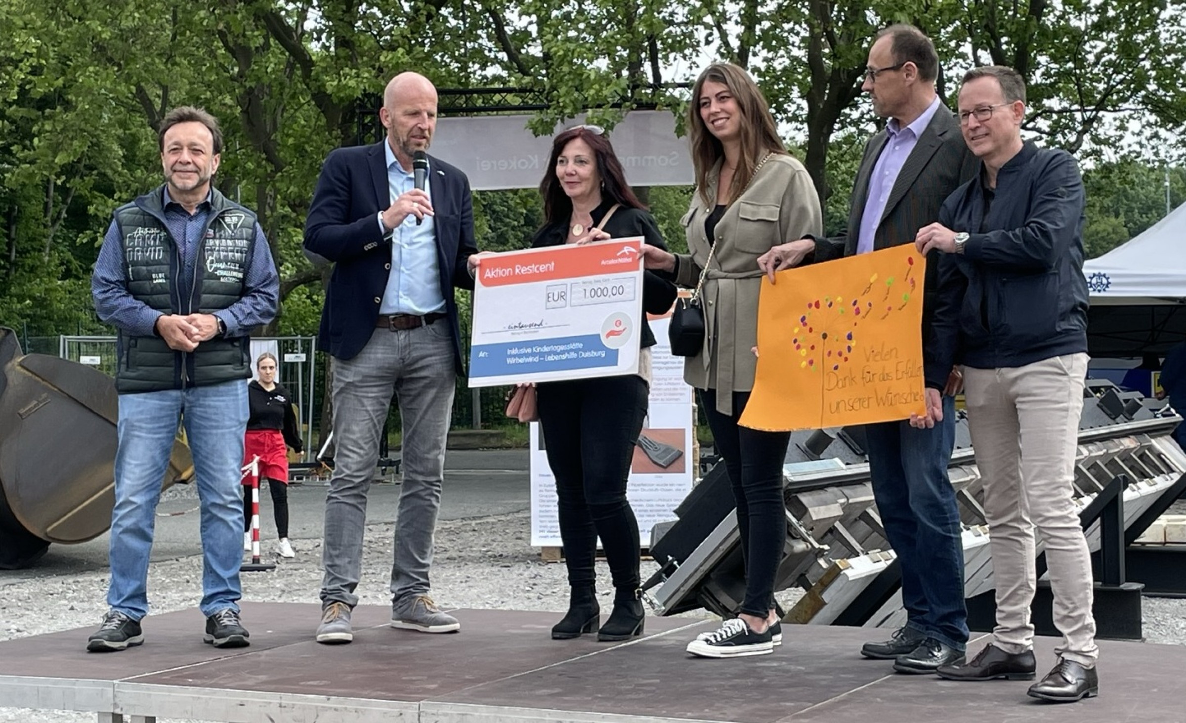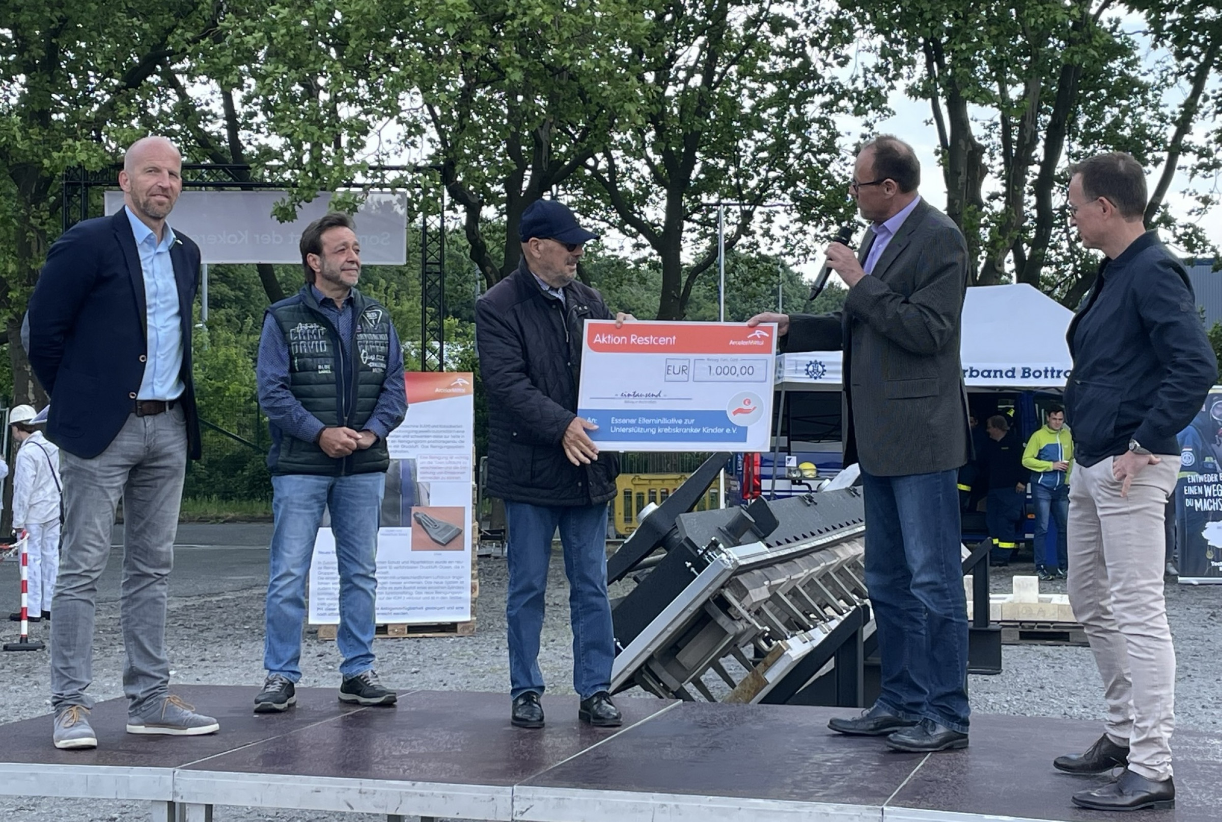 Organisatorisch gehört die Kokerei Prosper in Bottrop zu ArcelorMittal Bremen, und so unterstrich die Unternehmensführung sowohl die Zusammengehörigkeit der Standorte Bremen und Bottrop und gleichzeitig den gelebten Dialog mit den Mitarbeitern wie auch mit den Partnern in der Region. Aus Bremen waren dazu sowohl Frank Hohlweg, Vorstand Technik „Primary“, und Michael Hehemann, Vorstand Personal / Soziales und Arbeitsdirektor, zur Kokerei ins nördliche Ruhrgebiet gereist. Sie betonten die enge Verflechtung der Koksproduktion in Bottrop mit der Roheisenproduktion im Hüttenwerk Bremen. Für Standortleiter Dr. Thomas Degen und den Betriebsratsvorsitzenden Christos Tsourakis war es eine große Freude, die Verbundenheit des Unternehmens mit der Region durch Spenden an soziale Einrichtungen zu unterstreichen. Aus der ArcelorMittal Aktion „Restcent“ wurden gleich vier symbolische 1.000-Euro-Schecks übereicht - an die Essener Elterninitiative zur Unterstützung krebskranker Kinder e.V., die Schule am Tetraeder, den Deutsche Kinderschutzbund Bottrop e.V. sowie die Inklusive Kindertagesstätte Wirbelwind der Lebenshilfe Duisburg.