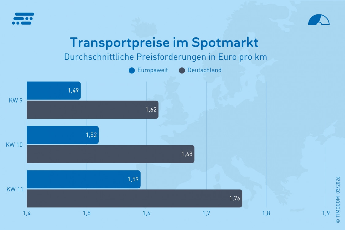 Nach Auswertungen der Spotmarktpreise in der TIMOCOM Frachtenbörse lag der von Frachtführern durchschnittlich verlangte Kilometerpreis für europaweite Transporte in Kalenderwoche 9 zunächst auf einem Jahrestief von 1,49 Euro/km. In KW 10 stieg dieser Wert auf 1,52 Euro und erreichte in KW 11 bereits rund 1,59 Euro/km. Damit erhöhten sich die durchschnittlichen Preisforderungen der Transporteure innerhalb von zwei Wochen um rund 6,7 Prozent.