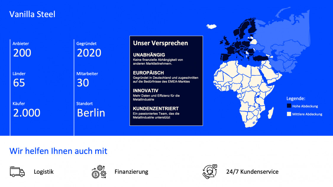 Vanilla Steel ist ein Unternehmen mit Sitz in Berlin, das Fachwissen und Erfahrung in der Metallindustrie mit digitaler Innovation und hohem Kundenservice für deren Nutzer verbindet.
