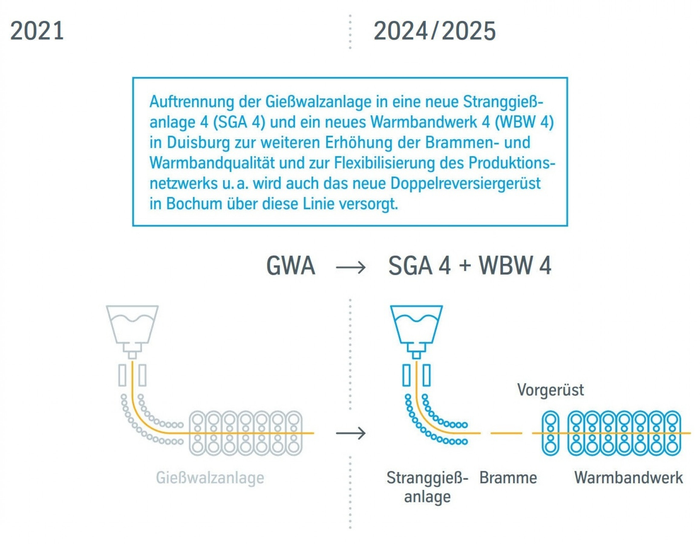 - Auftrennung der Duisburger Gießwalzanlage und deren Umbau in sowohl eine neue Stranggießanlage und ein neues Warmbandwerk,