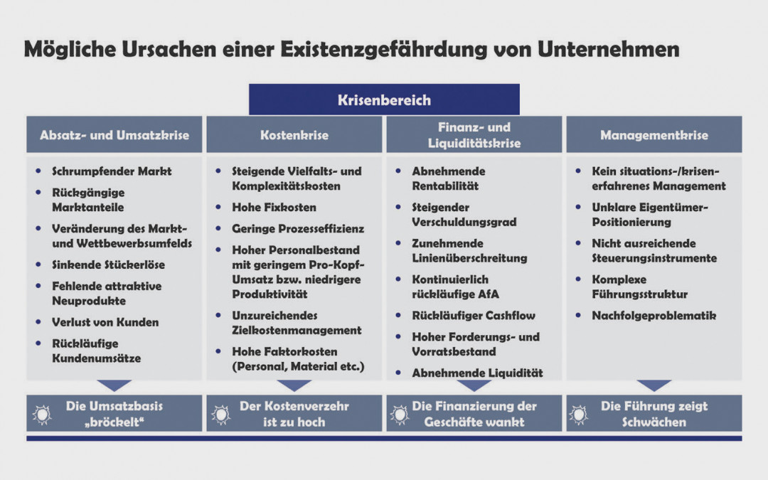 Werden diese Problemfelder rechtzeitig erkannt und die erforderlichen Gegenmaßnahmen ergriffen, dann muss z.B. aus der Managementkrise oder Absatz- und Umsatzkrise eines Unternehmens keine Existenzkrise erwachsen, die letztlich nicht nur einen Turnaround, sondern auch eine Sanierung des Unternehmens erfordert. Zwar verursachen vereinzelt sogenannte „Schwarze Schwäne“, also nicht oder nur schwer vorhersehbare Ereignisse wie die Finanzkrise 2008 oder der aktuelle Handelsstreit zwischen den USA und China Existenzkrisen von Unternehmen, dies ist jedoch eher selten.