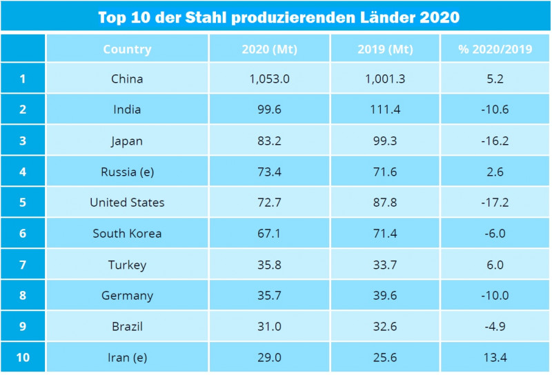 Die EU produzierte im Jahr 2020 138,8 Millionen Tonnen Rohstahl, ein Rückgang von 11,8 % gegenüber 2019. Deutschland produzierte im Jahr 2020 35,7 Millionen Tonnen Rohstahl, ein Rückgang von 10,0 % gegenüber 2019.
