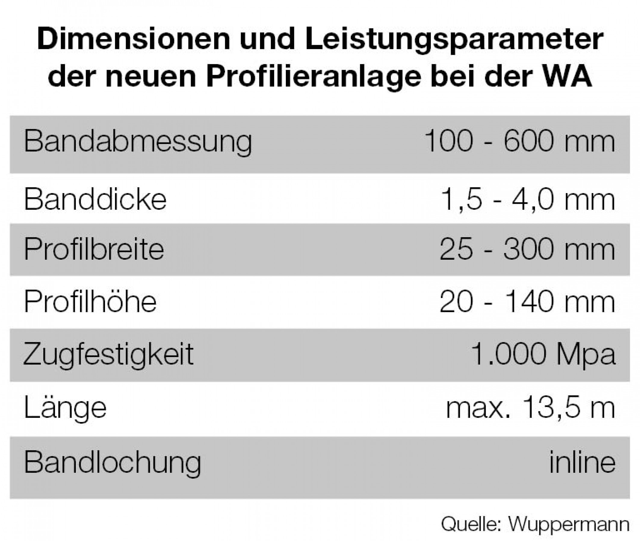 Wuppermann hat im März 2023 am österreichischen Standort Judenburg eine neue Profilieranlage in Betrieb genommen. Damit hat der Spezialist für verzinkte Produkte für höchste Korrosionsschutzanforderungen seine Fertigungsmöglichkeiten und Produktionskapazitäten erheblich erweitert. Die neue Profilieranlage mit automatischer Verpackungslinie bietet eine größere Bandbreite an Abmessungen und damit auch ein größeres Spektrum an Produkten. Es kann nun Vormaterial mit einer Breite zwischen 100 und 600 mm verarbeitet werden. Profile können mit einer Banddicke von 1,5 bis 4,0 mm, einer Profilbreite von 25 bis 300 mm, einer Profilhöhe von 20 bis 140 mm und einer Länge bis 13,5 Meter produziert werden. Mit einer Zinkbeschichtung von bis zu 1.300 g/m² (Z1300) oder einer Zink-Magnesium-Beschichtung bis zu 1.000 g/m² (ZM1000) und optionaler verzinkter Kante erfüllen auch diese Produkte höchste Anforderungen an den Korrosionsschutz. Außerdem können Stähle mit höheren Zugfestigkeiten bis zu 1.000 Mpa verarbeitet werden.