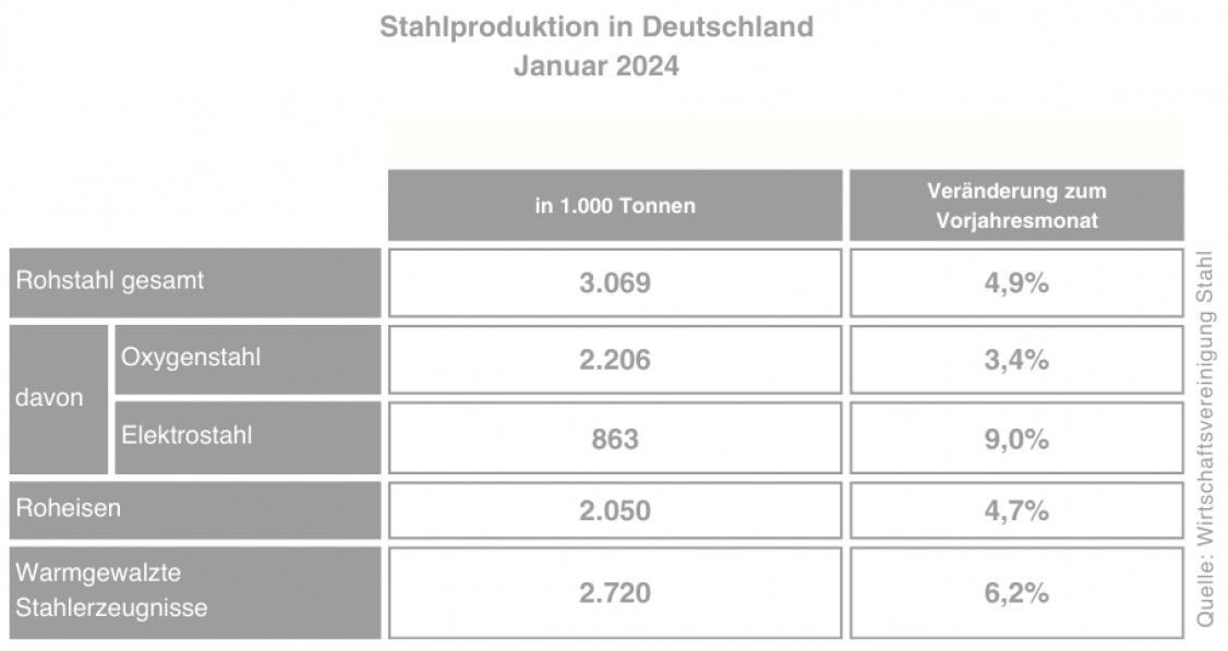 Besonders deutlich wird dies bei der Elektrostahlproduktion, die zwar im Januar um 9 Prozent zulegen konnte, aber insgesamt weiterhin besonders niedrig ausfällt. Zum Vergleich: Im Jahr 2021, im Erholungsjahr nach der Corona-Krise, lag die Produktion bei dieser Verfahrensroute mit 12,1 Millionen Tonnen rund 14 Prozent über dem Januarwert von 2024.