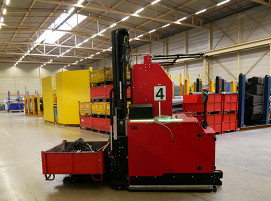 Ein mit Ausschuss beladenes Fahrzeug des Fahrerlosen Transportsystems auf dem Weg zur Kippstation.