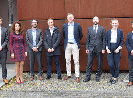 Gruppenfoto der 8 Partner. Von links nach rechts: Romain Deshayes (Gazelenergie), Anamaria Zianveni (Encevo), Geoffroy Anger (GRTgaz), Leo Benotteau (HDF Energy), Philip Brammen (Steag), Frank Gawantka (Creos), Katharina Poirier (H2V), Michael Marion (SHS - Stahl-Holding-Saar).