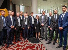 Die Grande Region Hydrogen EEIG (GRH) mit Partnern aus dem Saarland, Grand Est und Luxemburg stellten gestern in Paris ihr Ziel des Aufbaus einer grenzüberschreitenden Wasserstoffwirtschaft vor.  v.l.: Franck Leroy, Präsident der Region Grand Est, Sebastian Vogel - RWE, Yannick Bonnin - H2V, Damien Havard – HDF Energy, Thierry Trouvé - GRTgaz. Jean-Michel Mazalerat - GazelEnergie, Antoine Huard - Verso, Jonathan Weber – SHS, Anke Langner - Iqony, Jens Apelt – Creos Deutschland, Claude Seywert - Encevo, Frank Gawantka – Creos Deutschland, Pit Losch – Attaché für Wasserstoff-Projekte im Luxemburger Ministerium für Energie und Raumentwicklung