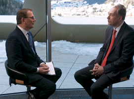 Burkhard Dahmen, Vorsitzender der Geschäftsführung der SMS group GmbH, (rechts) im  Gespräch mit CBS-Moderator Anthony Wilson (links) während des Weltwirtschaftsforums in Davos